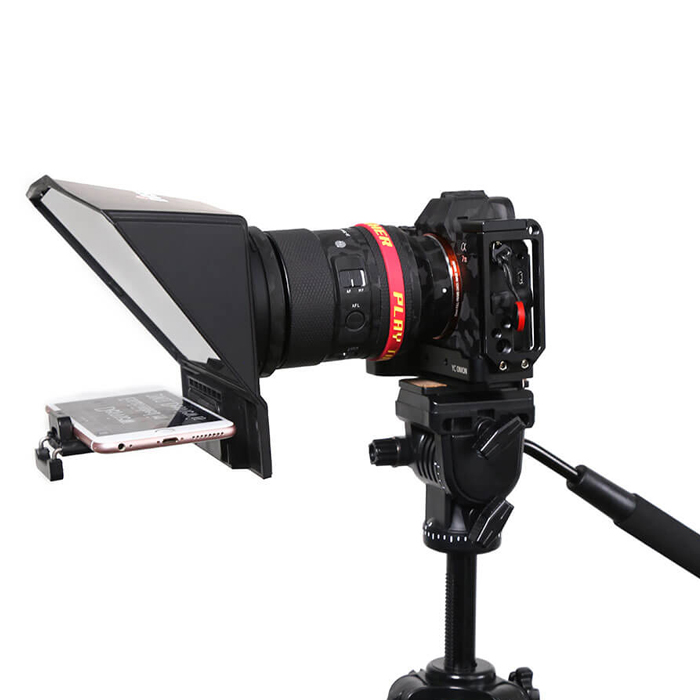 T2-teleprompter stöder universellt surfplatta (under 8 tum)/smartphone-uppmaning + DSLR-filmning. Dessutom är den kompatibel med smartphone-fotografering (linsen måste justeras). Den stöder vertikal/horisontell placering av enheten och fotografering till vänster/höger.