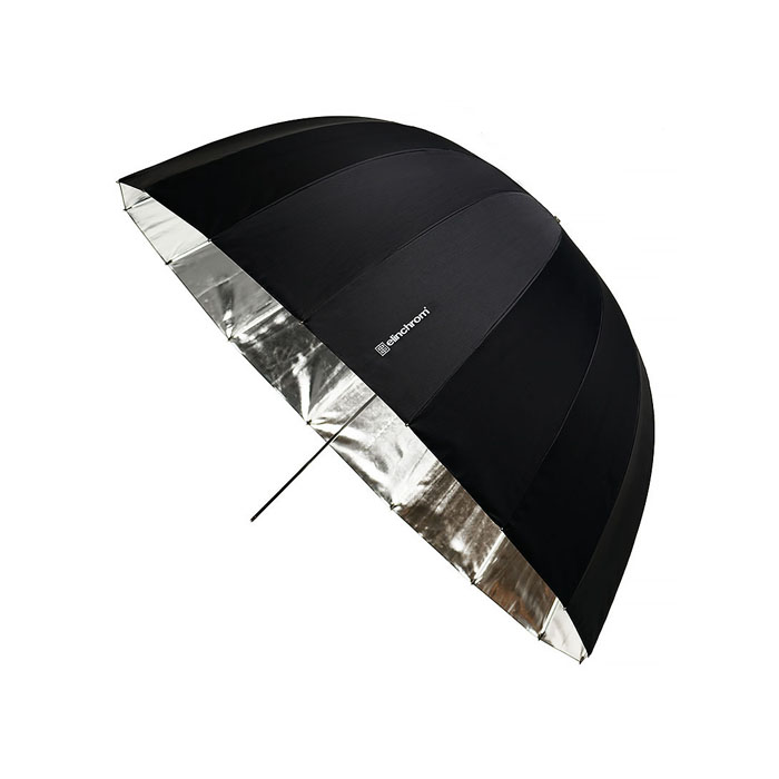 Elinchrom paraply med parabolisk form ger ett mer riktat ljusflöde jämfört med standardparaplyet. Storleken, diameter 105 cm, i kombination med silverklädd insida ger fotografen stora möjligheter att rikta det relativt hårda ljuset.