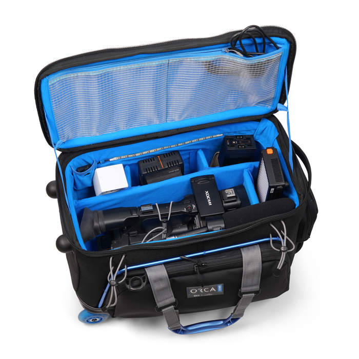 Orca Trolley videoväskor med integrerat trolleysystem kommer i två storlekar (OR-10 och OR-14), vardera med 3 externa fickor, inbyggt LED-ljus, vadderad axelrem, starka hjul och vagnssystem och en flexibel inredning.