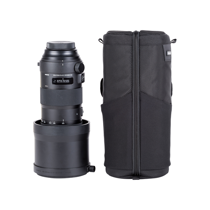 Den modulära påsen rymmer ett 150–600 mm f/ 5– 6.3-objektiv med huvan omvänd.